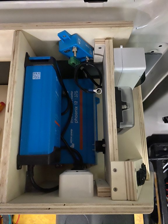 Boven de koelbox zit naast de gootsteen een stukje loze ruimte welke lastig te benutten was. Daarom had ik besloten daar een mini electrakastje te maken. Ook zit dit nog relatief dicht bij de 2 accu etc. Achteraf bleek deze ruimte eigenlijk wat te klein te zijn en ga ik dit de volgende keer zeker anders doen. Een extra draadje aansluiten is nu echt een hele vervelende klus... gelukkig ziet het er van buiten allemaal heel fraai uit..