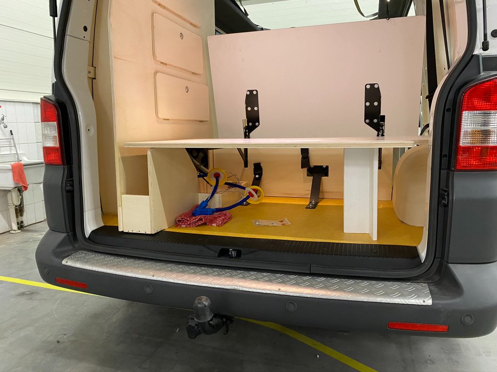 Tijdens de voorbereidingen leek het allemaal mooi te passen, echter wat ik niet goed had gerealiseerd was dat zodra het aanrecht er permanent op zit.. en de voorstoel permanent op zijn plek zit.. het een hele onhandige plek is om te werken..