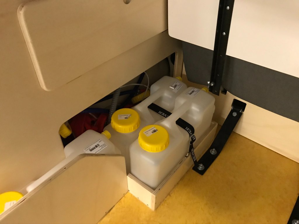 Een andere stap om nog te bouwen waren de schoonwater en grijswater tanks. Om in de keukenkast geen kostbare ruimte te verliezen hebben we deze achterin geplaatst, door de hoogte van de Atrion slaapbank paste eigenlijk maar 1 type tank onder de bank.