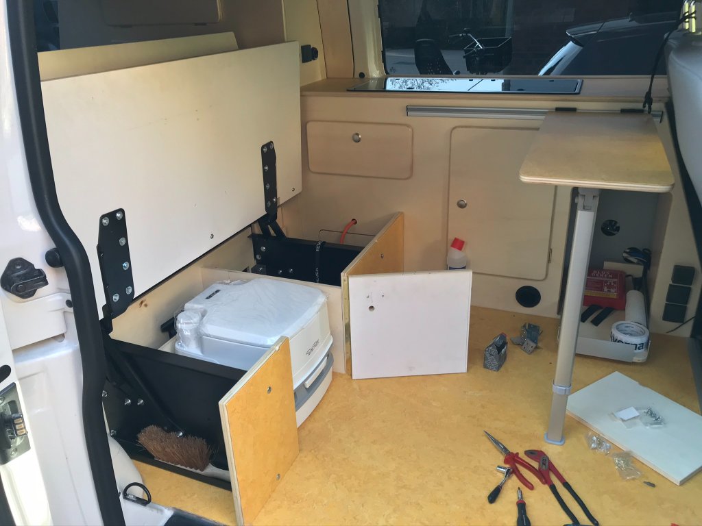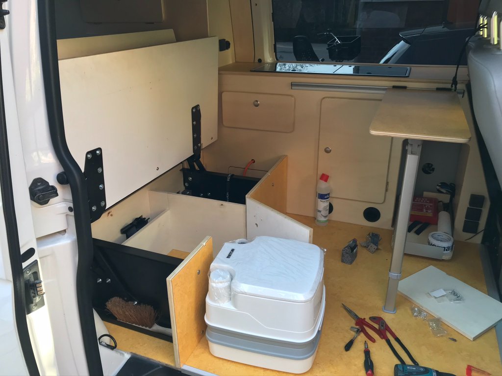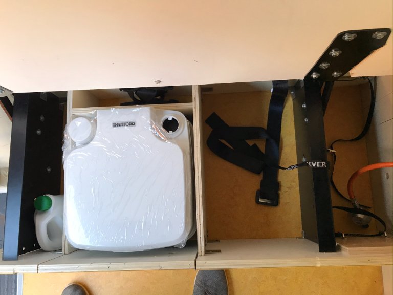 De enigste logische plek werd daarom onder het zit deel van de slaapbank... Na veel passen en meten, en het lenen van een porta potti bleek daar alleen het kleinste model te passen.