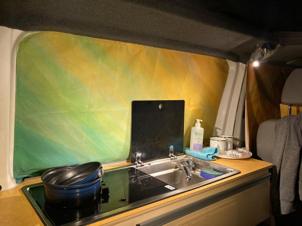 We hebben 2x 12 liter schoonwater en 1x 12 liter grijswater. Dit is net genoeg om 2 hele dagen mee vrij te staan is onze ervaring. We koken dan een volledige maaltijd zoals pasta en drinken veel thee. Na de avondmaaltijd doen we dan ook nog een spaarzaam afwasje en af en toe was je natuurlijk je handen... Het Liefst had ik nog wat meer schoonwater meegenomen, want om 2 dagen echt vrij te staan en overdag ook voldoende te drinken, moeten we wel voorzichtig met het water omgaan. Wellicht in de toekomst een grijswater tank onder de bus...