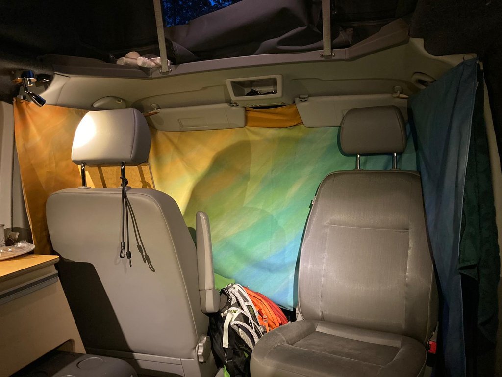 Voor de vooruit hangt de stof aan de jas haakjes bij de stoelen en achter de zonneklep. Ook dit systeem werkt prima weten we inmiddels uit ervaring.
