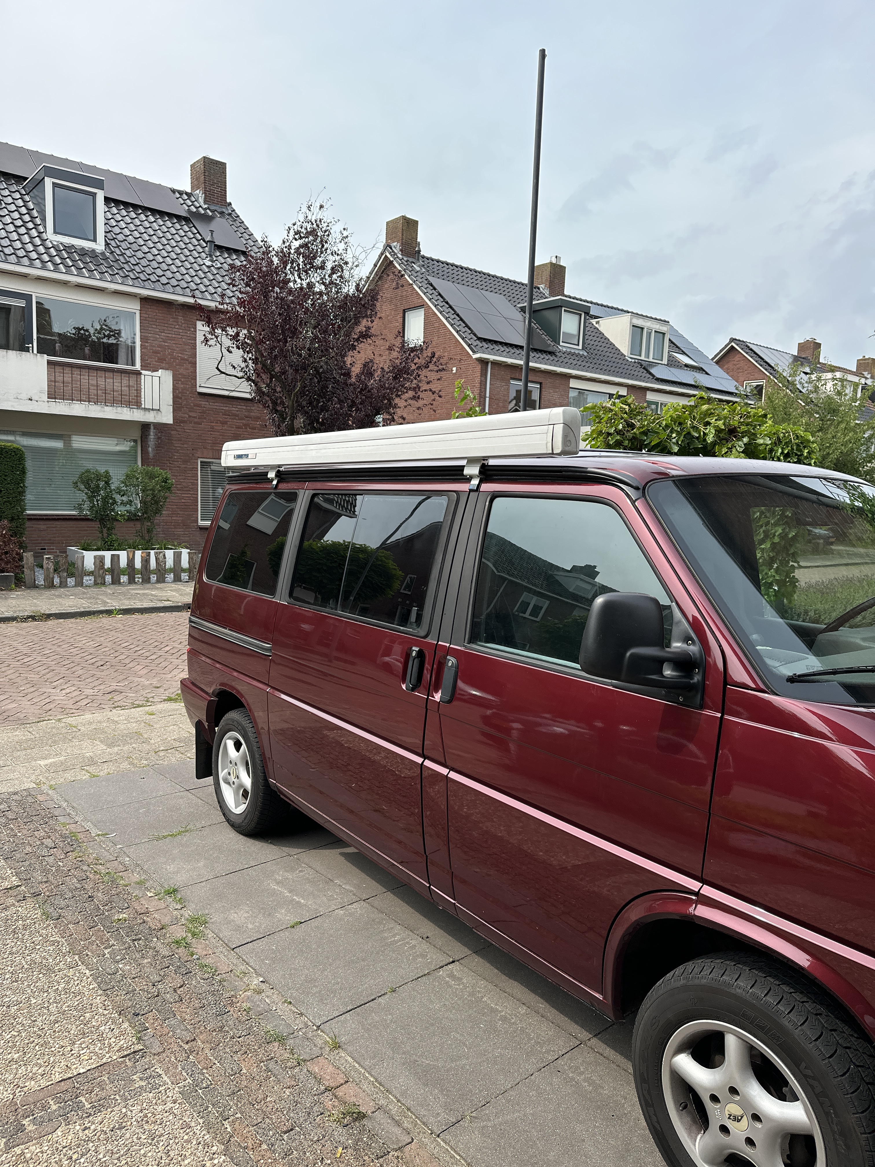 Ik had eerst mijn alu sidebars al eens zwart gespoten. Waar het om gaat is een goede 2k ( tweecomponenten ) primer. Na het succes van de sidebars ook mijn luifel gedaan. Zelfde kleur als de bus.