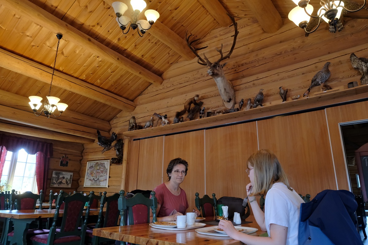 In Grue brandstof en koffie getankt. Nog een "vaffel" erbij, waarom niet? Boven Grue echter wordt de rivier Rotna noordwaarts gevolgd en de bosweg werd bij elke afslag smaller en slechter. Kilometerslang aan 10km/u, voorzichtig manoeuvrerend langs de grotere stenen, behoorlijk steil omhoog en omlaag. (Alles is natuurlijk relatief, met een jeep of motorfiets is dat daar poepsimpel). Was ook wat stressy, ik was er niet zo gerust op. Gingen we er door geraken of niet? Els haar opmerkingen waren ook nogal onrustwekkend eigenlijk ipv bemoedigend of rustgevend.