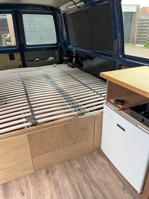 Begint nu wat te worden, hh-accu/omvormer op zijn plaats, koelkast erin (gaat er ook weer uit (trekt te veel stroom)