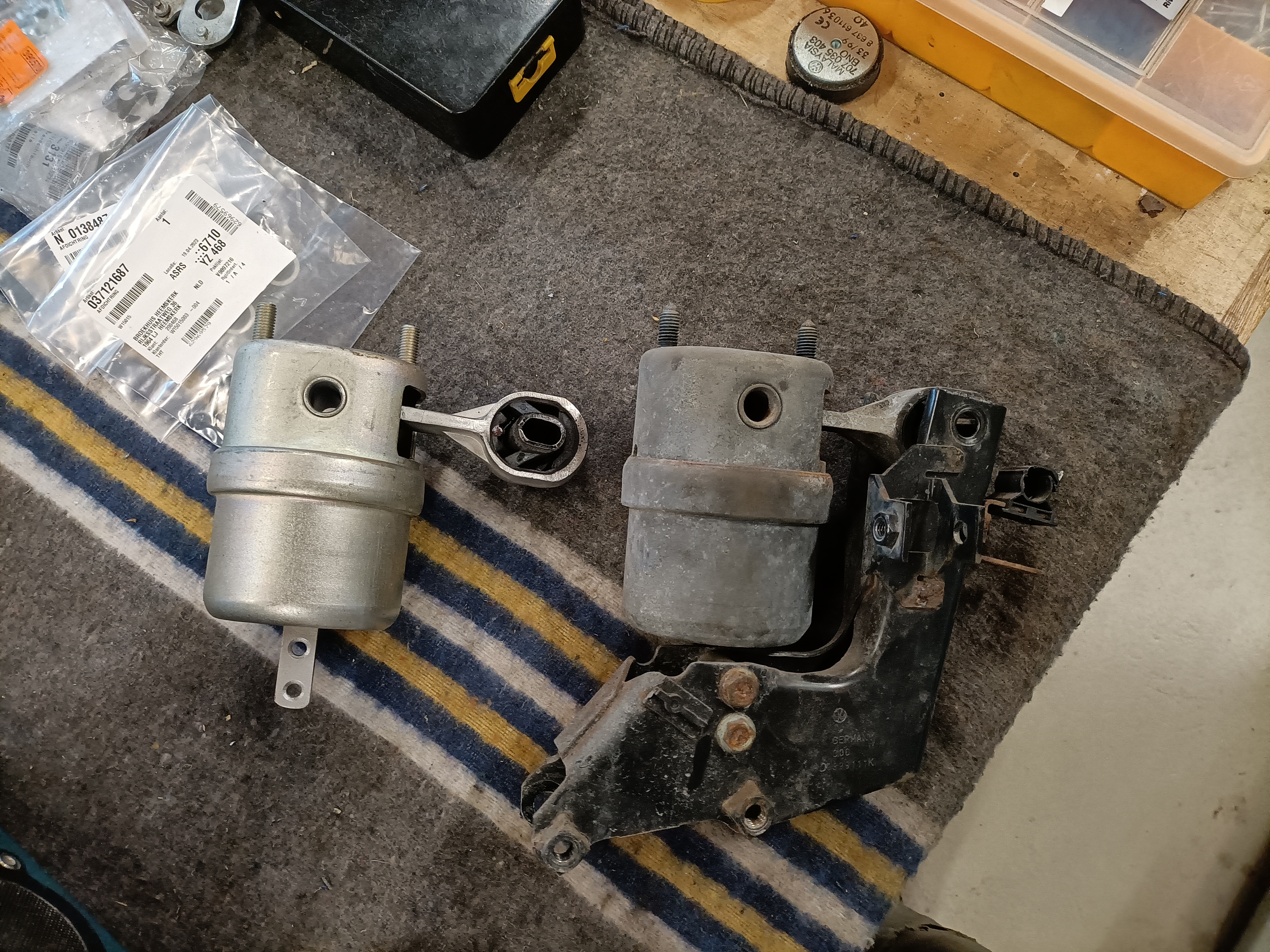 Twee krikken er onder, zodat ik een beetje kan sturen, om de motor steun in de gaten van de ophanging kan sturen.<br />Voor een beetje liften is motor naar achteren, en achter liften maakt dat de motor voorover kantelt.<br />Zo kun je toch redelijk eenvoudig de steunen wisselen