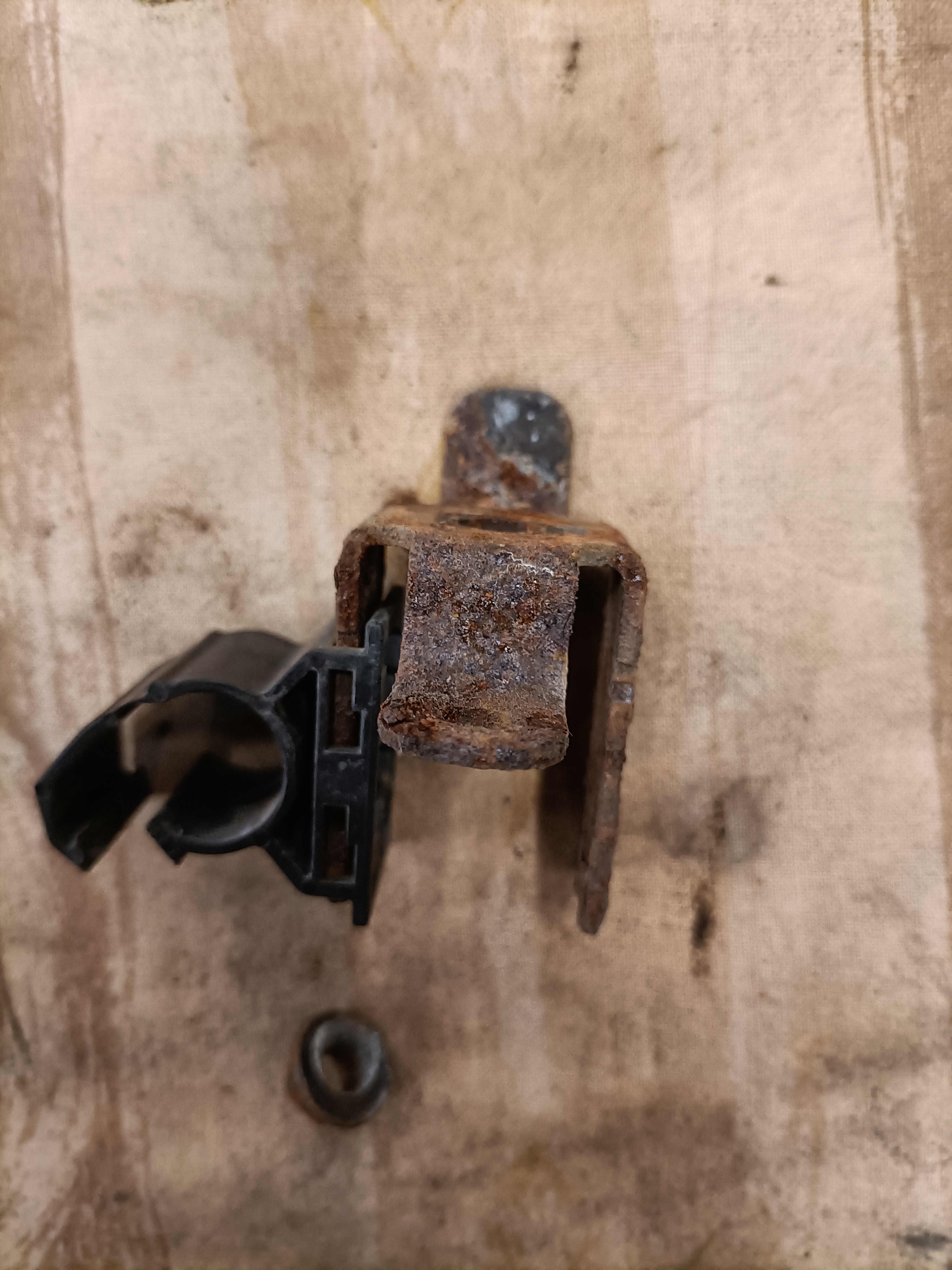 Van het voorste oog van de steun, was het rubber trouwens uitgescheurd.