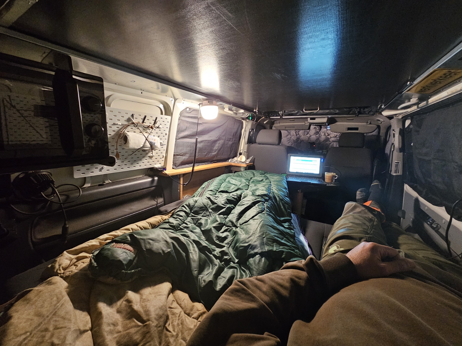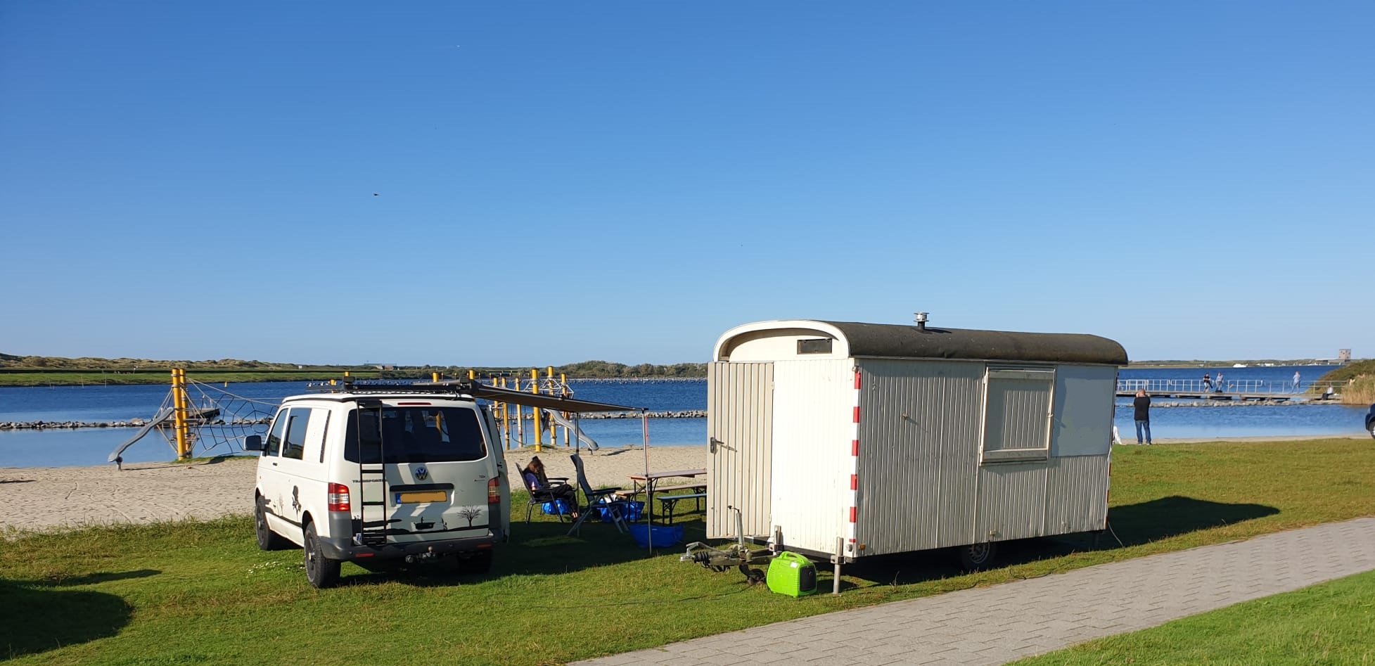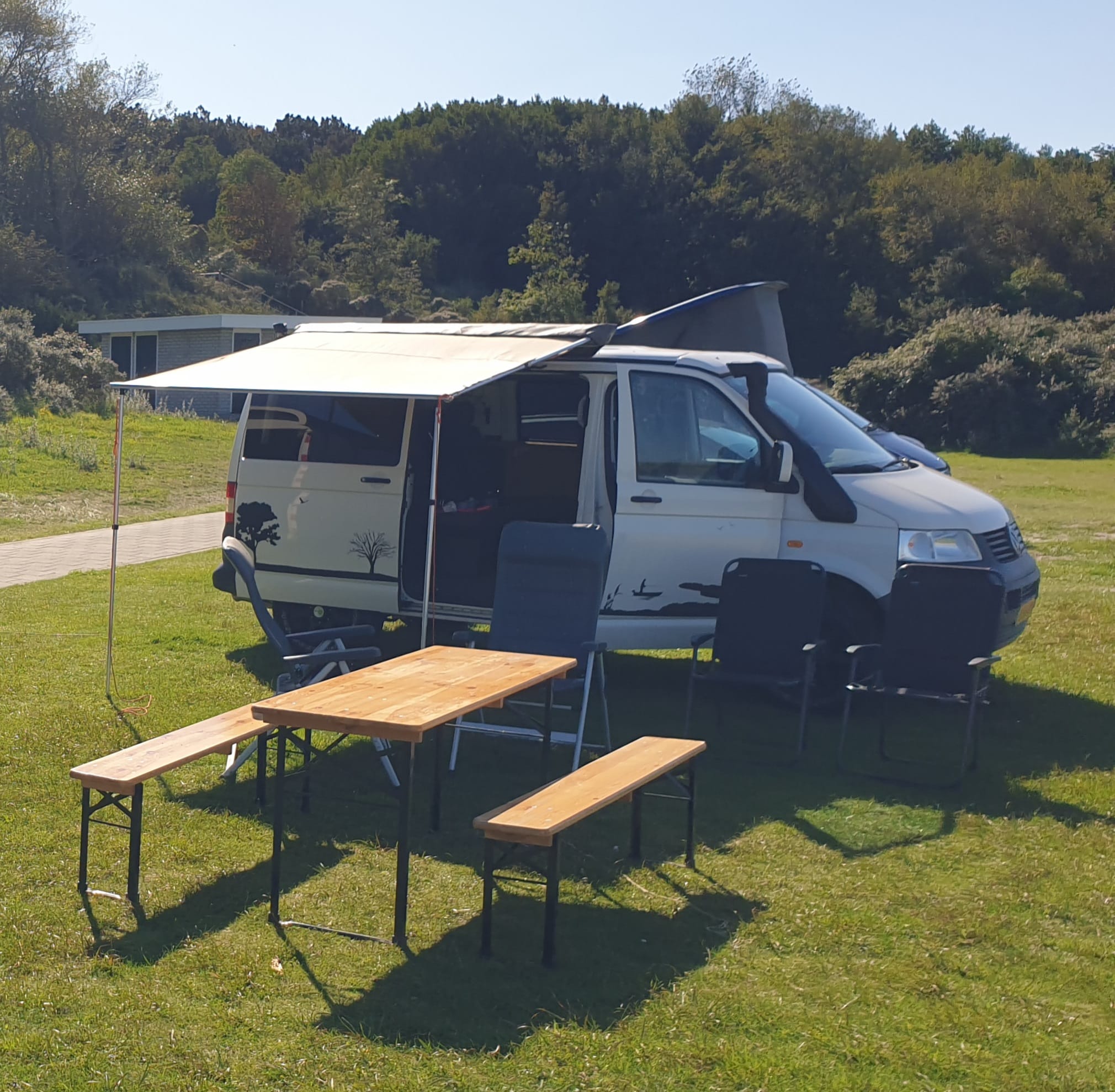 genieten doen we.... of ik dan toch tijdens werkuren. Als ik alleen weg ben gebruik ik de multivan slaapbank icm 1 draaistoel. heb ik meer dan voldoende bed aan. De senseo is gesneuveld, nu aan de oploskoffie en heet water uit een kommetje in de magnetron.