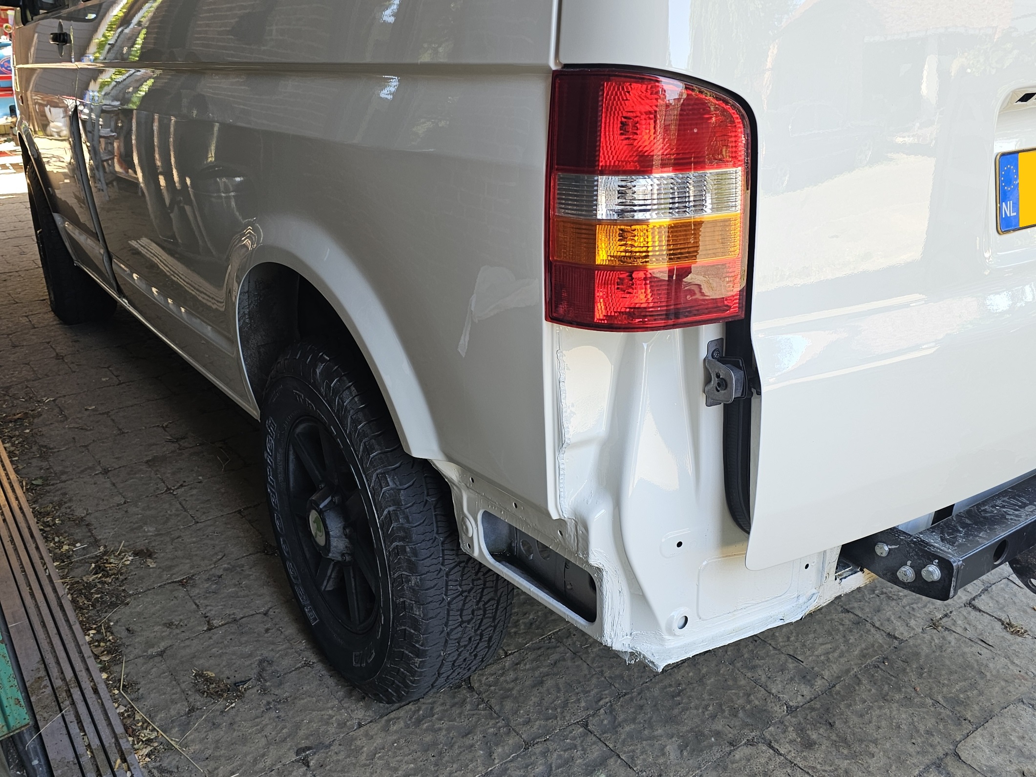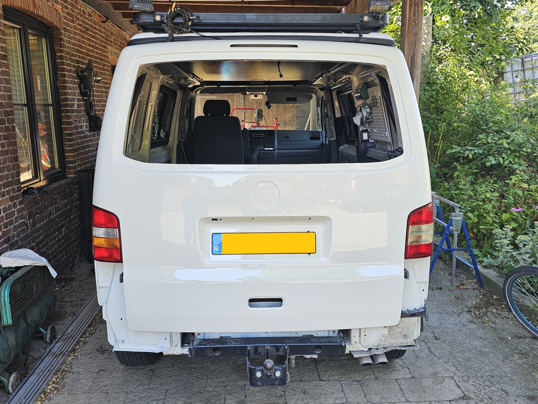 Achterkant komt al in de buurt. Ik heb alle lichtunits die ik heb met elkaar vergeleken maar kon geen fatsoenlijke set ervan samenstellen. Gewoon net teveel verschil, ofwel merk ofwel ouderdom, ofwel lichtbeeld..... Heb ze gewassen en gespoeld maar dat werd hem ook niet. Bij Winparts set LED gekocht want ze waren daar goedkoper dan waar ook op ebay, THQ etc.. Tot ik ze gekocht had want dag erna alles uitverkocht of meer dan €80 duurder voor een set? Ik Heb gelijk nieuw 3e remlicht en led kentekenverlichting mee besteld. De led kentekenverlichting past wel wat montage betreft maar niet in de fittinkjes. Daar heb ik e.e.a. gesoldeerd. Eigen samengestelde uitvoering/type op de klep geplakt met mat zwart 26mm letters. 6mm spacing en tierap als maat en uitlijning gebruikt. Had enkel de 4motion iets kleiner gewild in ca 15 mm maar die hadden ze niet in dit lettertype. De rode letters/cijfer heb ik zelf maar overgespoten. Nu nog even wachten op een kentekenplaathouder met camera voor het achteruit rijden/aanpikken aanhanger. Kabels zijn al getrokken. Heb getwijfeld tussen inbouwcamera in plaatwerk of tussen de kentekenverlichting in te bouwen. Maar eentje op de kentekenplaathouder was mij makkelijker. De kabel kan dan wel via de lijst de klep in. Komt een nieuw matzwart VW logo in het midden. Was even zoeken maar ik denk dat ik er een in Tsjechië gevonden heb, GLS is onderweg zag ik. Bumpers laat ik ouwe bouwvakkersbus uitvoering.....die gaan er het eerst aan in het veld. Zijn originele en die zijn meer vergevingsgezind en flexibel(er) of hebben meer elasticiteit. Ik heb al gemerkt dat de after-market gelijk versplinteren als je wat raakt, of geraakt wordt.