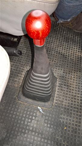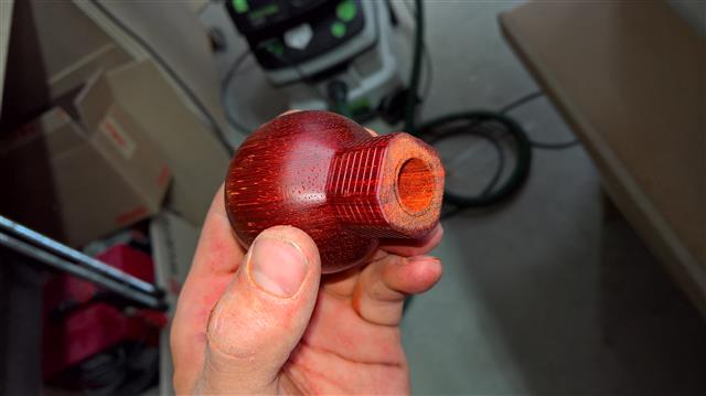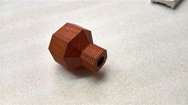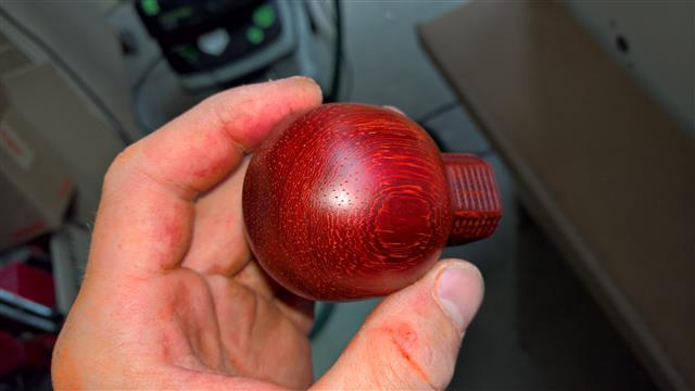 Ik heb er ook een nieuwe pookknop voor gemaakt: Bij gebrek aan een draaibank, de knop op een boormachine gezet, laten draaien en bijgeschuurd. Mooi, en het ligt lekker in de hand
