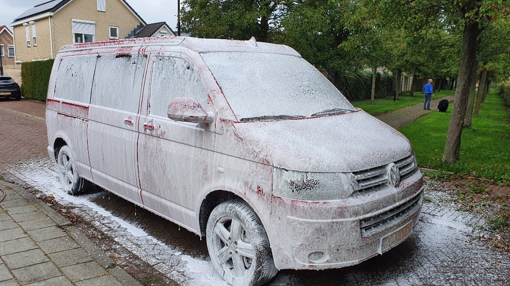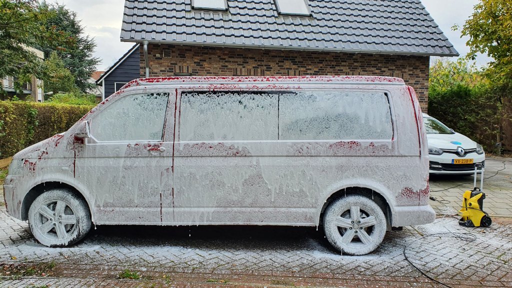 Bij thuiskomst meteen de bus even gefoamed, zodat alle stof en verbouw resten er zonder krassen afgespoeld worden..
