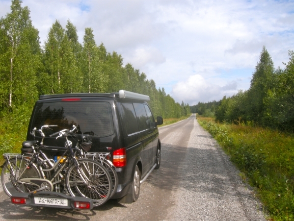 Op de oneindige steenslagwegen van Zweeds Lapland. Je rijdt zo een uur zonder ook maar iemand tegen te komen.