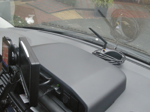 Update: Set in de bus geplaatst. Op het dashboard achter de DIN een zwart dekseltje van een sauspotje gemonteerd. De antennevoet blijft hierop zitten door de magneet in de voet. Voet kan dus ook zo door het raam buiten op de bus (zuignapjes) geplaatst worden. In de DIN de Alfa gemonteerd. Hierop de antennekabel vastgemaakt. Kabel loopt door de DIN en ligt daarna losjes om de voet. USB-kabeltje kan na gebruik in de DIN opgeborgen worden. In de bus heb ik al een prima ontvangst. Update maart 2011