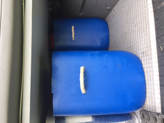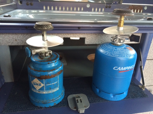 We koken binnen op kleine gasbrandertjes, dat scheelt een grote fles in de kast en geen onderhoud en lekkage aan slangen! Minpunt: het is wel wat vaker verwisselen en de druk is op het eind treurig laag..... De brandertjes zijn ontdaan van de pannendragers en passen precies in twee houders in het kastje onder de kookplaat. Het gas draaien we aan en uit vanuit dit kastje. Mijn pa heeft er twee aluminium platte schijfjes bij gemaakt die er voor zorgen dat er geen rotzooi uit de pan in het kastje kan belanden.