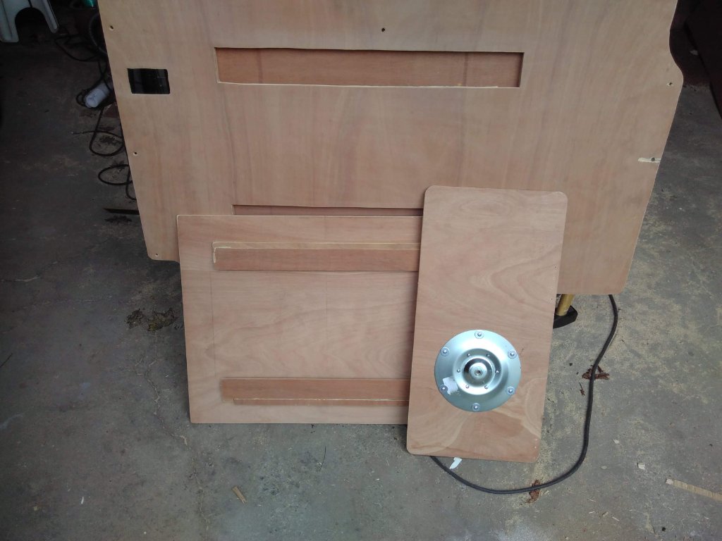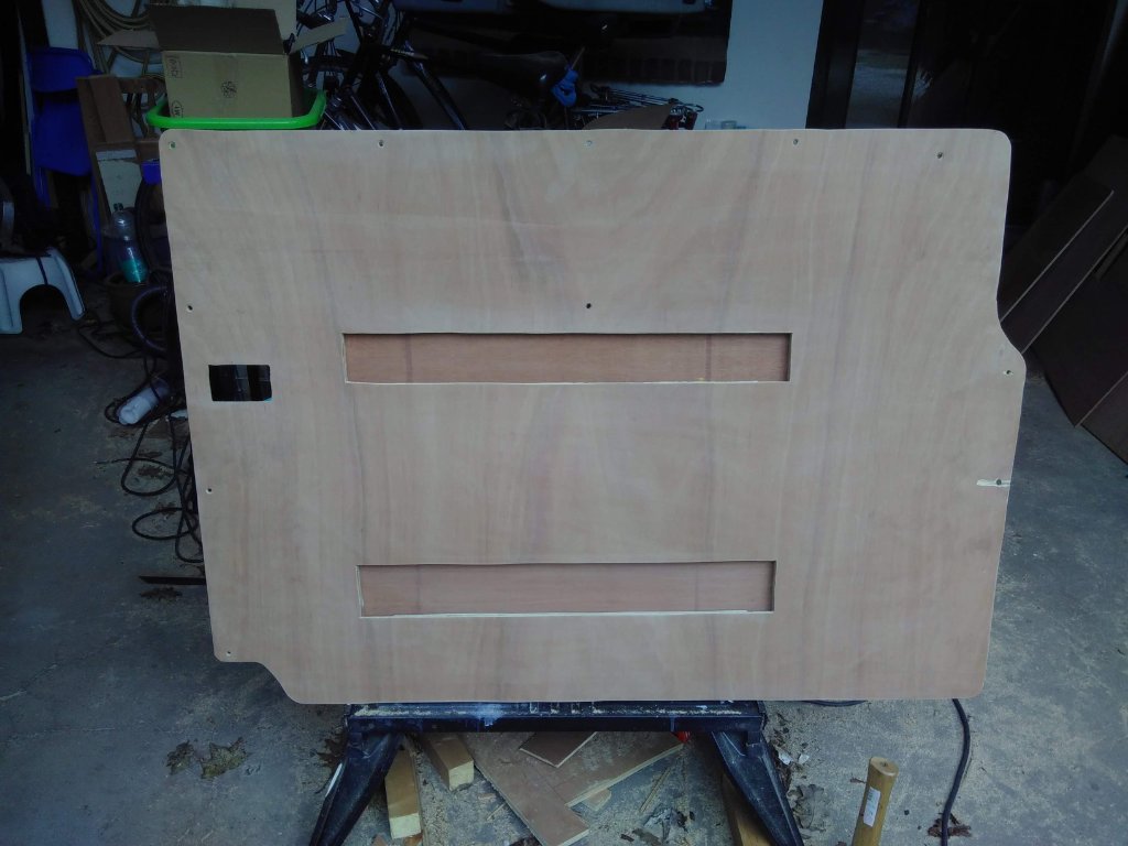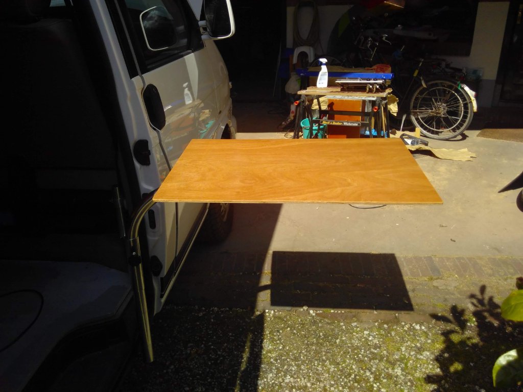 Ik was al van plan om het hardboord paneel in de schuifdeur te vervangen door een triplex plaat en heb meteen wat uitgeprobeerd om er een tafelblad in op te hangen.