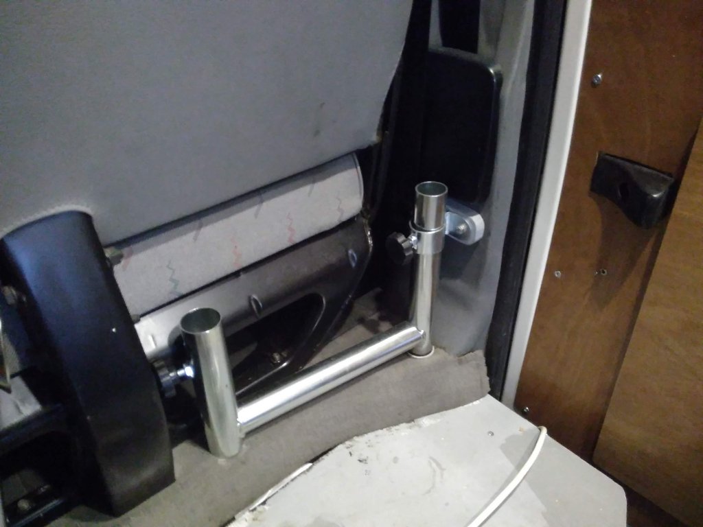 De beugel voor de zwenkpoot zit met m6 blindklinkmoeren in de B-stijl geschroefd en het voetje op dezelfde manier in de vloer.