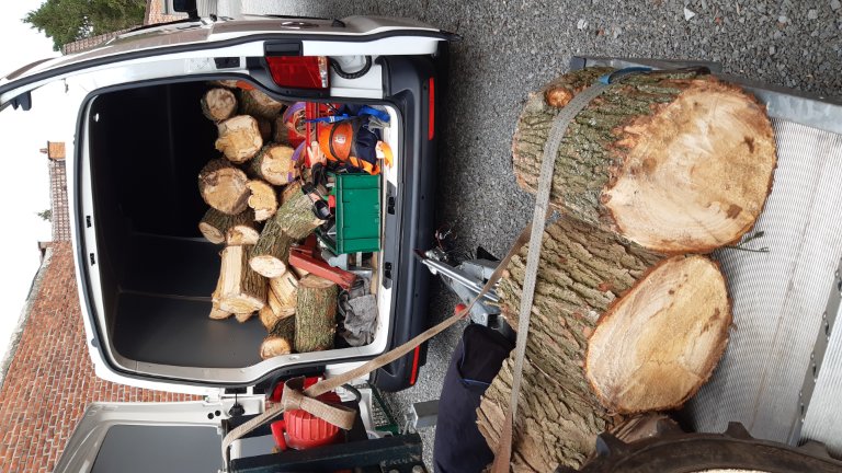 Maar er lag 1 kuub hout in (dus ik denk rond 550kg) , plus nog mijn werkgerief(samen rond 150kg)