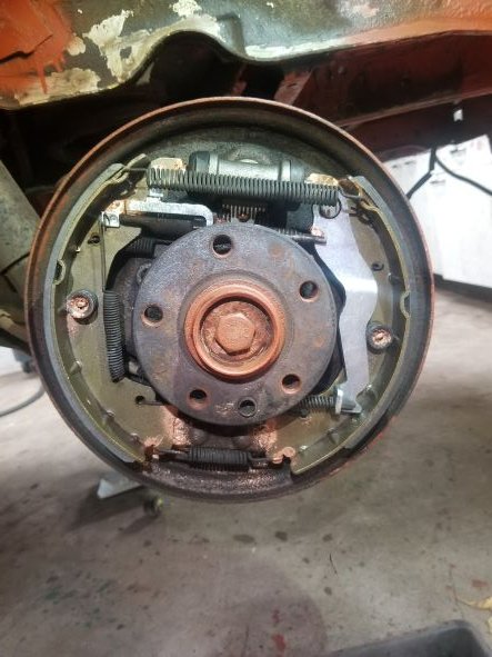 De achterremmen waren een stuk minder, de beide remcilinders (links&rechts) hebben flink gelekt en daardoor waren de remschoenen ook doorweekt met remvloeistof, veel remstof ook. Alles eraf gehaald en schoongeborsteld.
