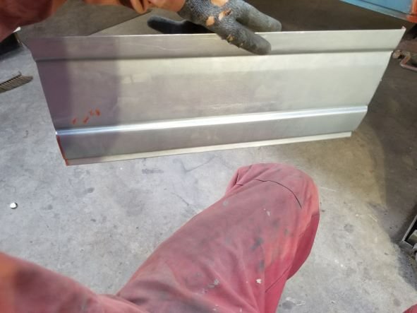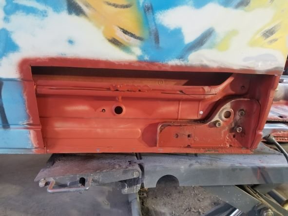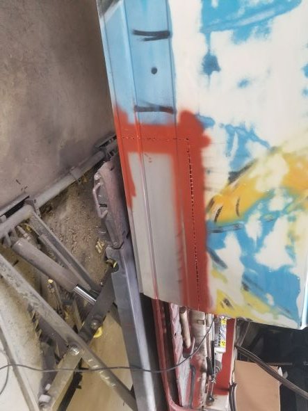 Er zat nog een deuk en roestplek in de schuifdeur, deze uitgeslepen en een nieuw stuk ingelast