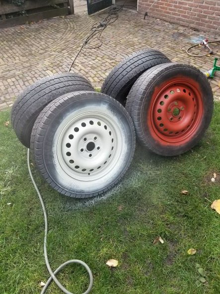 Ook de velgen in de lak gezet, morgen komen er 4 nieuwe Hankook banden op, de groene naafkappen moeten het dan afmaken.