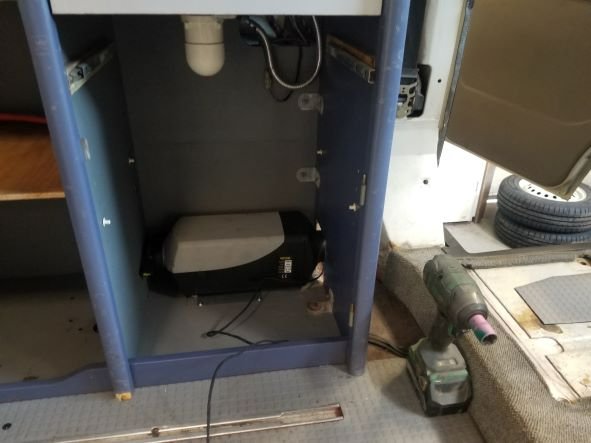 Standaard is deze T4 niet uitgerust met een standkachel, daarom een nieuwe diesel standkachel gemonteerd in het keukenkastje.