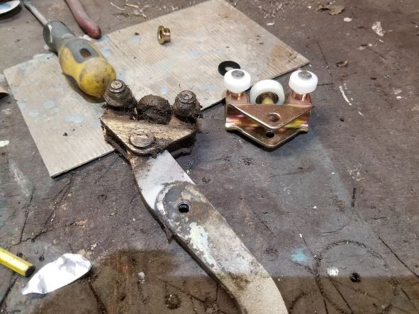 De schuifdeur ging ook niet al te soepel meer, daarom deze geleiderwieltjes ook allemaal vervangen (onder in de goot en in de rails)