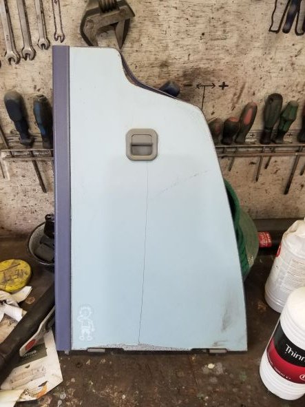 Het interieur was beplakt met plakfolie. Verschillende kleuren, maar deze blauwe folie was heel lastig te verwijderen. Het Folie ging er wel makkelijk af met een verfbranden, maar er bleef een zeer hardnekkige laag met lijm achter.