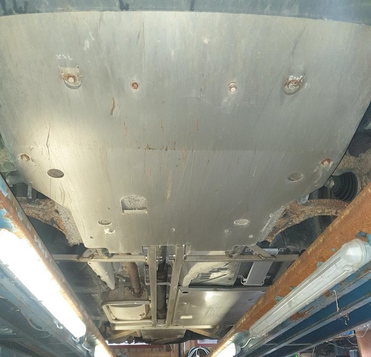 De RVS bodembescherming is er van onder. Toch wel een beetje puinzooi...... Gelaserd materiaal en alle randen gewoon scherp. Daar wordt je niet blij van. Veel bouten op onmogelijke plekken, had met iets meer zorg op maatvoering geen probleem hoeven zijn. Dan nog de veels te lange bouten, staken zover uit dat bij beschadigen demontage helemaal onmogelijk zou zijn. Tank is heel, veel zand, geen gruis of stenen daaronder. Werd wel tijd dat de RVS dorpelbescherming er eens af ging. Is vooral vies en net bij de instap op de rand wat lakschade.