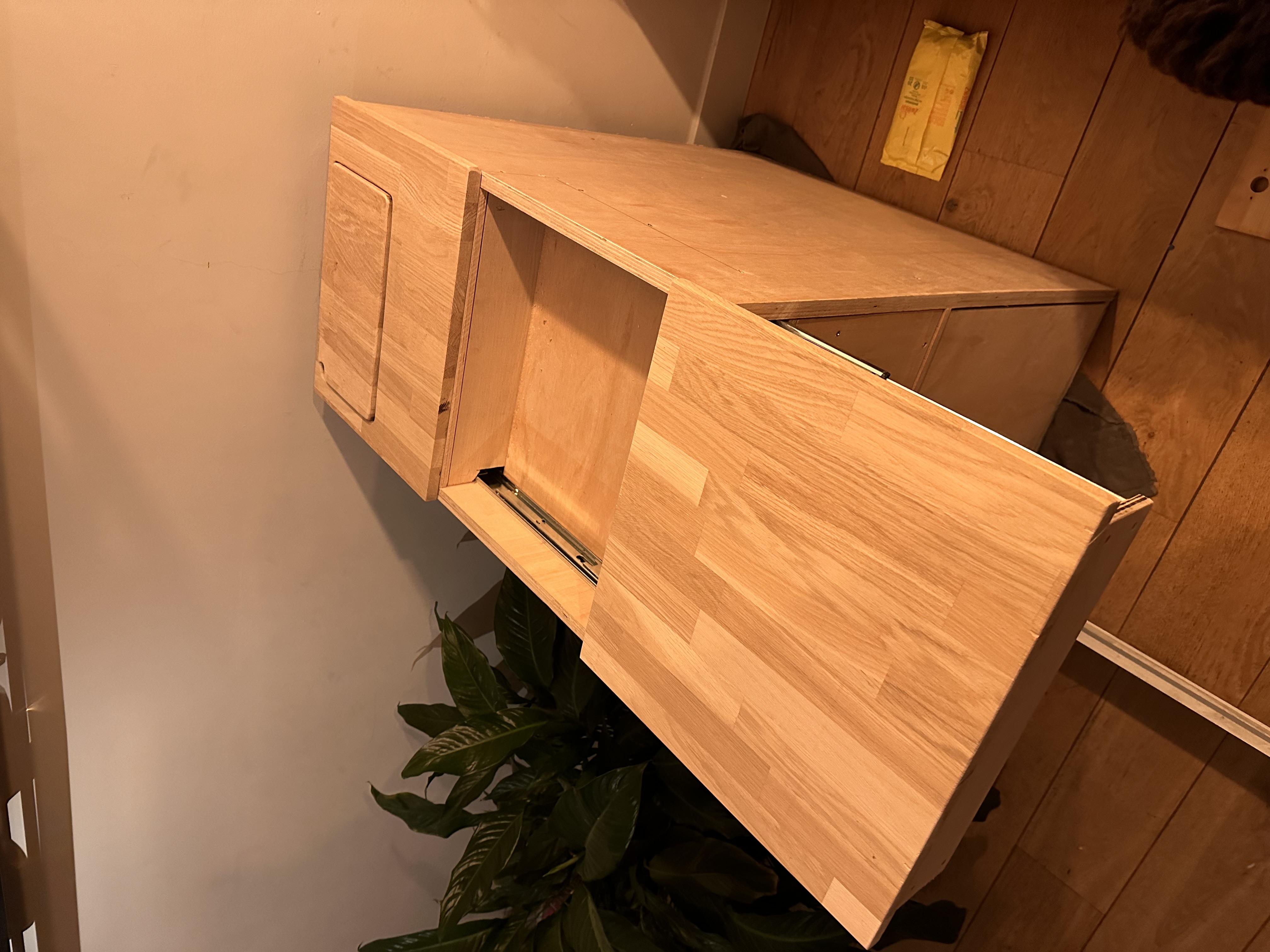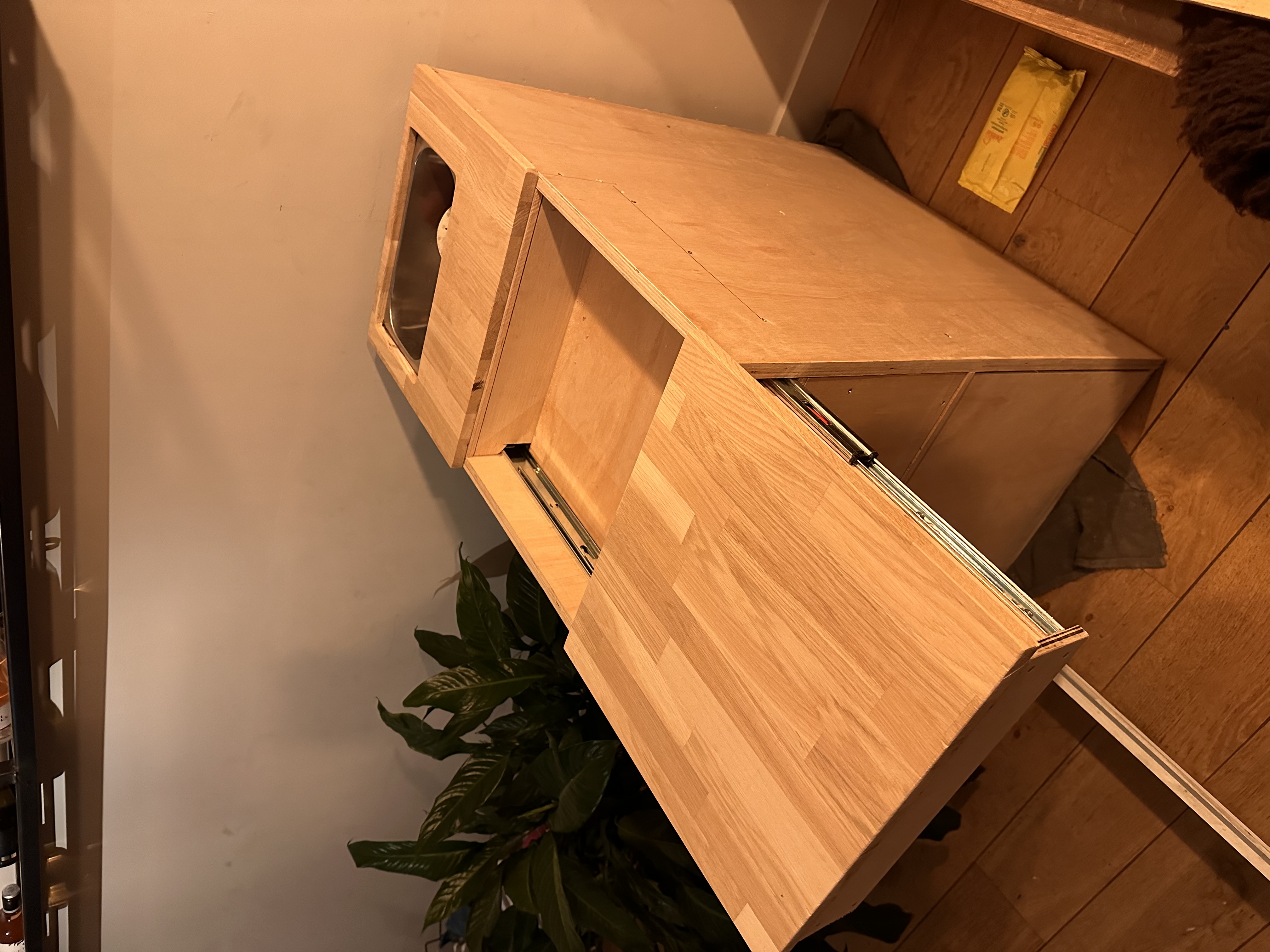 Dat is een mooi stukje huisvlijt. Ik neem aan dat de kookpitten in de bak onder het uitschuifgedeelte komen. Maar als dit helemaal uitgeschoven is en je bent aan het koken, kan je dan nog iets uit de bovenste lade pakken?