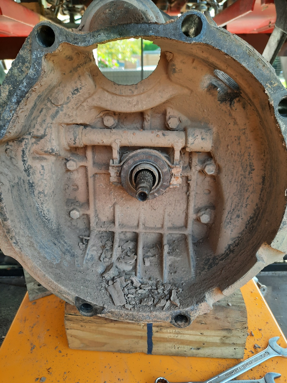 Bleek dat de rubber die normaalgezien het inspectiegat van de versnellingsbak afsluit verdwenen was , en er dus heel wat slijk in het koppelingshuis geraakt was.