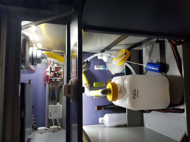 Vanmorgen de bus maar even opgeruimt en schoon gemaakt vanbinnen na ons weekeindje weg. Blijkt de dop van de watertank met de doorvoer van het pompje stuk te zijn. Gelukkig had ik er nog één, die ik kon vermaken. Het was nog wel even een werkje omdat de elektra ook los moet om de nieuwe dop om de kabel en slang te krijgen.