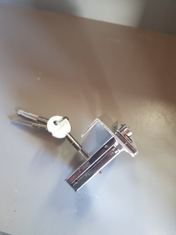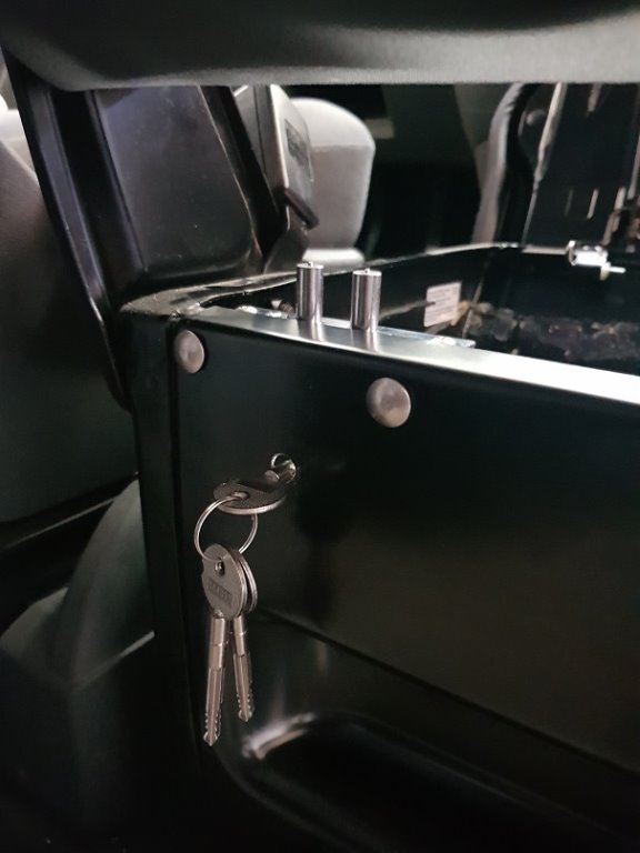 Iets wat ik nog steeds wilde maken was een kluisje in het voorbankje voor je laptop, camera en dergelijke alleen wist ik nog steeds niet hoe precies. Gisteravond kreeg ik een idee om de klappende zitting van het bankje van een slot te voorzien zodat het hele bankje een afgesloten ruimte zou worden. Vandaag uitgevoerd met een penslot. De zitting kan je, op de hoek bij de deur een stukje oplichten, maar zit verder geblokkeerd door het slot. Een redelijk eenvoudige oplossing zo.