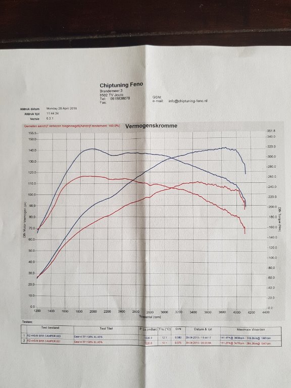 Vandaag de bus laten chiptunen hier in Joure bij Fedde Noppert. Ik was toen ik de bus net gekocht had in November 2016 al eens bij hem geweest met de vraag of de bus al gechipt was omdat hij zo fris reed, nee was het na uitlezen het antwoord, gewoon standaard met waarschijnlijk iets meer vermogen dan 102 pk. Ik heb het dus zo gelaten en tijdens onze reisjes in 2018 heb ik hier ook niet meer over nagedacht, we waren voornamelijk in vlakke gebieden. Afgelopen paas weekeind waren we in het Sauerland met behoorlijk wat heuvels. Na drie heuvels was het mij wel duidelijk, hier mag wel iets vermogen bij. Van de week een afspraak gemaakt en van morgen de bus naar Fedde. Op de rollenbank kwamen de volgende feiten naar boven: 111,2 PK @ 3470 rpm en 264,3Nm @ 1947 rpm. Fedde heeft zijn kunstje gedaan en bij de volgende meting op de rollenbank was het dit geworden: 141,1 PK @ 3856 rpm en 319,8 Nm @ 1965 rpm. Ben benieuwd hoe het rijd in de heuvels of bergen tijdens ons volgende tripje.