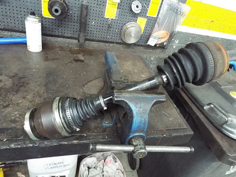 En de aandrijfsas gedemonteerd om de hoes te vervangen.