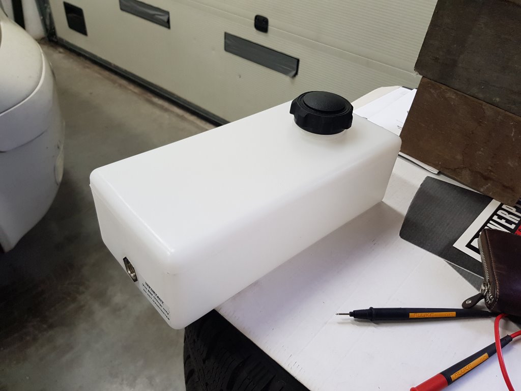 Intussen de bus uitgepakt alle bedegoed en kleding in de was en porta potti en watertankjes leeg. Dit is al het vuile water uit de gootsteen van bijna 4 weken met ons kampeer gedrag. IK wist al dat het weinig zou zijn van voorgaande tripjes en had al een nieuw en heel klein tankje besteld. Deze nu nog inbouwen met een aftap onder de auto. scheelt gelijk plek in het keukenkastje zodat daar mooi andere spulletjes kunnen staan of, indien nodig, extra water. Groeten,