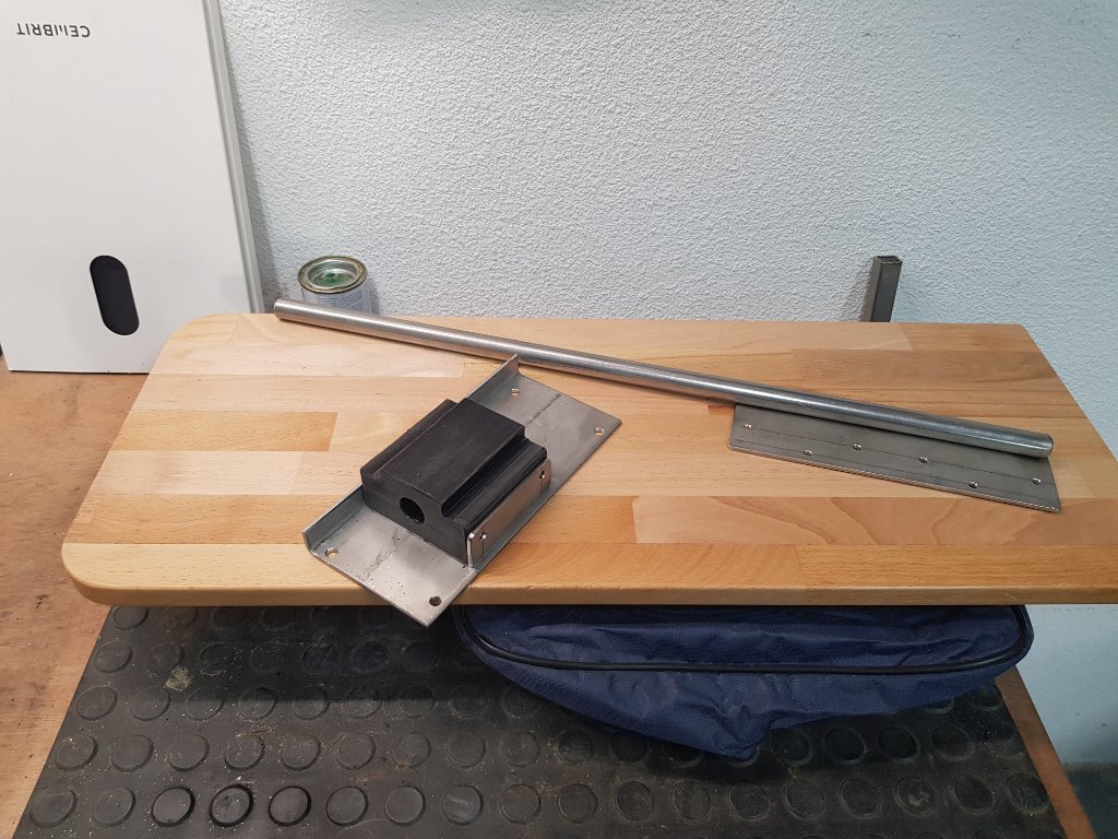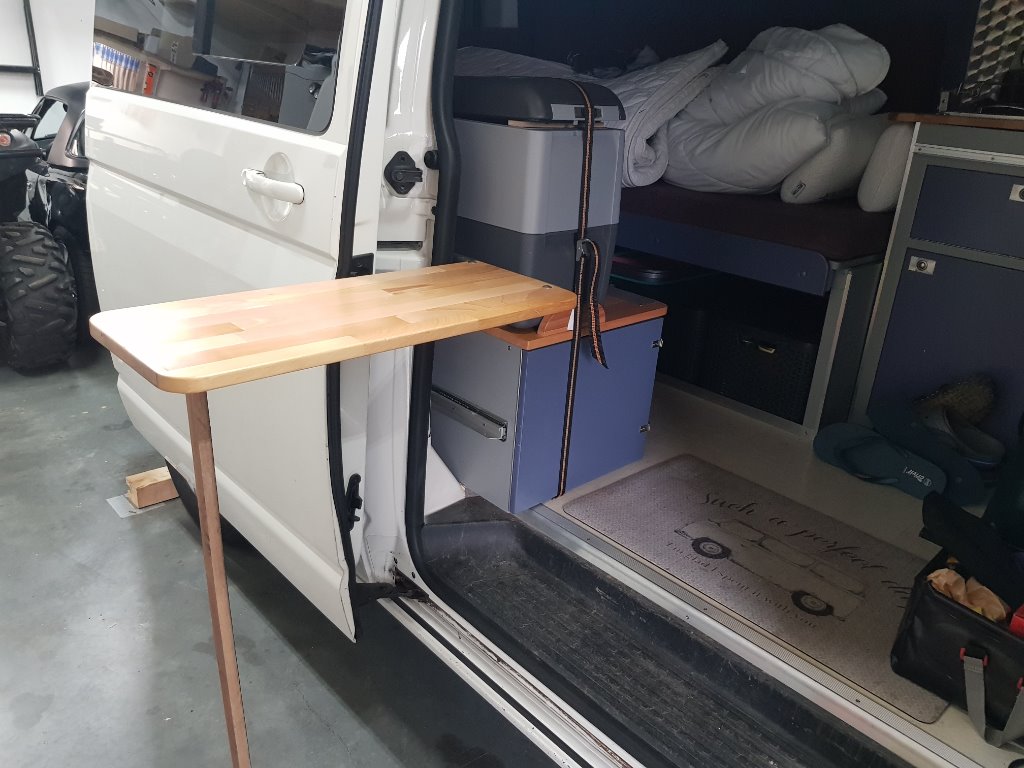 Tussen alle werkdrukte toch nog even iets kunnen maken wat we heel graag wilden. Een uitschuif/klap tafeltje op aanrecht hoogte voor het bereiden van bijvoorbeeld de lunchbroodjes buiten, dus goed rechtop staand en zonder kruimels en dergelijke binnen. Bijna af, alleen nog een pootje verzinnen. Denk nu aan een horizontaal uitschuif dingetje aan de binnenkant van de schuifdeur zodat het nooit in de weg zit.