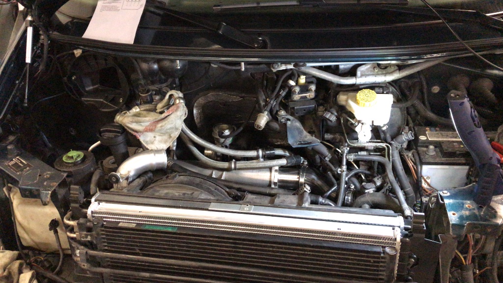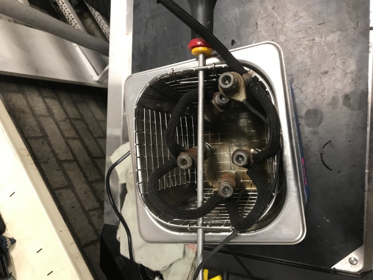 De verstuivers zijn al gereviseerd, nog even in een ultrasoon badje gedaan en gemonteerd, verse retourslangetjes. Nieuw watermondje erop, nieuwe pierburg vacuümpomp. Nieuwe interkoeler en radiateur erop, puur voorzorg want wat eraf komt zag er nog ok uit en lekten beide niet.