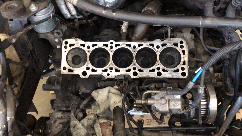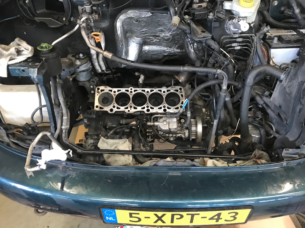 De nieuwe kop weer opgebouwd met uitlaatspruitstuk met turbo er al op. Mijn AHY inlaat vervangen voor een AXG model incl de EGR vervanger. Nieuwe gloeipluggen erin. De originele inlaat was al redelijk vol met roet, schat dat de inlaatkanalen voor 20% dichtgeslibd waren.
