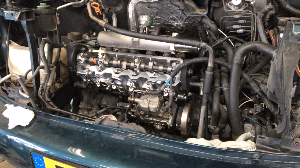 Kop erop gezet en alles nagetrokken zoals het moest. Waterpomp vervangen, nokkenasliniaal erin, krukas op tijd gezet en snaar erop. Pompsnaar erop. Verse trillingsdemper ook uiteraard en een nieuwe multiriem.