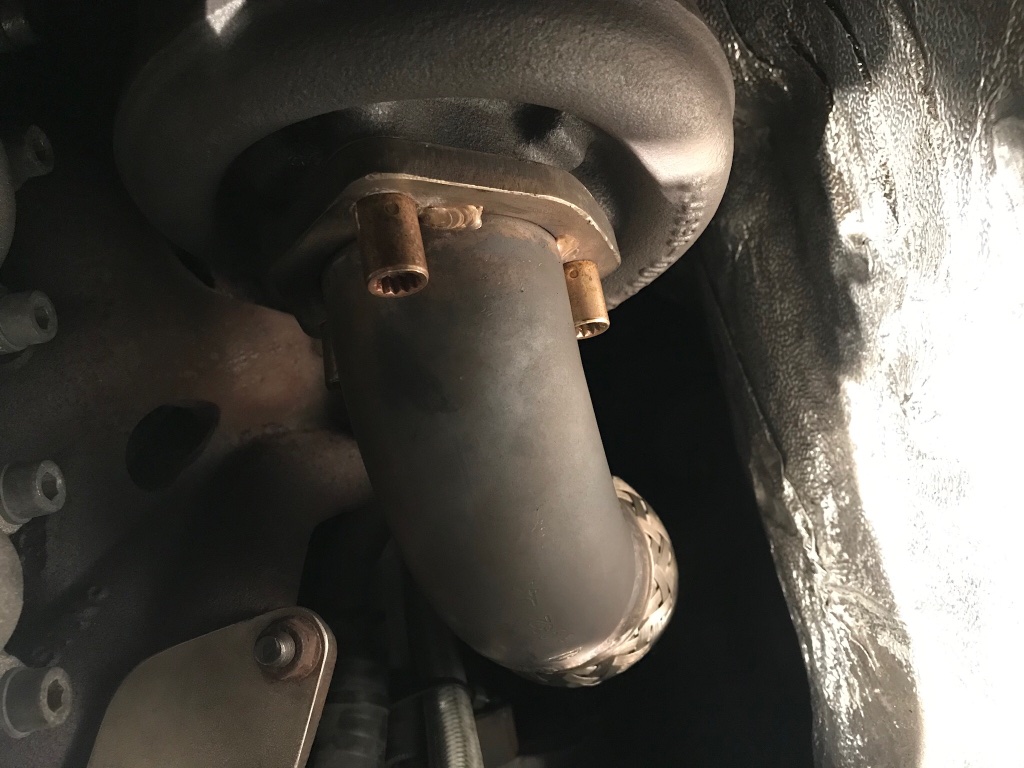 In de lengterichting van de gaten heb ik de downpijp 'ingedeukt' en de originele moertjes heb ik verbannen naar de eeuwige jachtvelden. Ik heb moeren gebruikt van de nieuwe generatie Transporter/Crafter, deze hebben een inwendige 12kant.