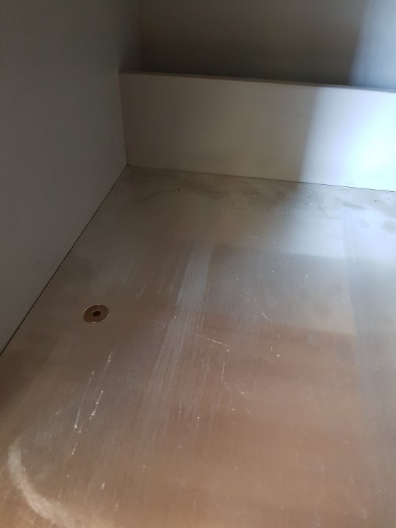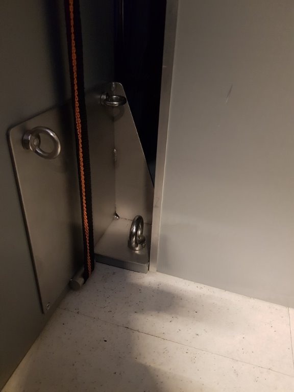 Een ander ding wat ik nog steeds graag wilde is de porta potti kast, en daar mee ook de koelbox beter vastmaken aan de bus voor het geval van noodstop of aanrijding. Nu heb ik op de bodem van de kast een plaat 4 mm aluminium welke met een M10 verzonkenkop bout vast zit aan het bestaande ladingbevestigingspunt van de bus en aan de achterkant loopt een deel van de 15 mm bodemplaat door welke vast zit aan het andere punt. Een spanbandje loopt onder het geheel door en deze doen we rond de koelbox tijdens het rijden. Het tweede bevestigingspunt vond ik nogal wat zwak dus daar heb ik nu een RVS steun op gemonteerd zodat de spanband maximaal vast zit aan de bus. Groeten,