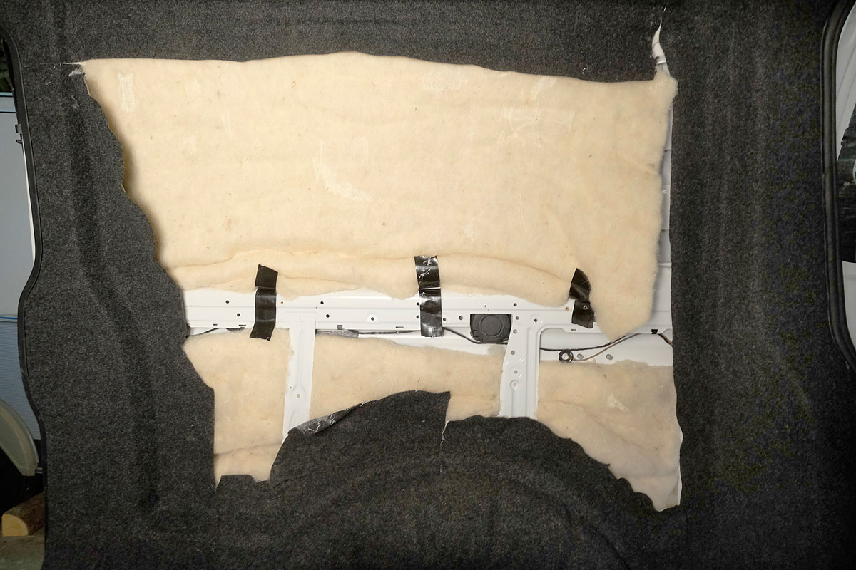 Vervolgens heb ik nagedacht over de te trekken elektrische draden. Daarna heb ik wol gebruikt en, niet te zien, ontdreuningsplaten. Als laatste heb ik de met vilt beplakte panelen weer op zijn plek gezet.