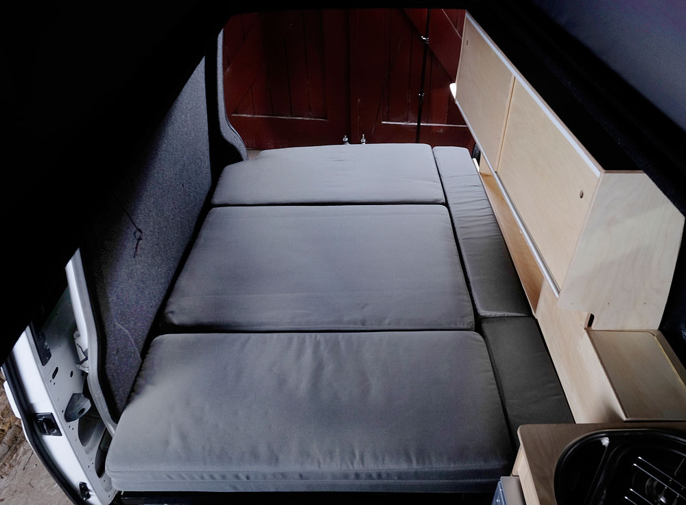 Deze RDW goedgekeurde slaapbank bestaat uit 3 delen. Het achterste gedeelte, dus bij achterdeuren / achterklep, is vast. Daaronder is wel ruimte voor bv tuinstoelen.