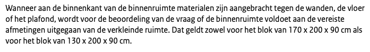 Wanneer aan de binnenkant van de binnenruimte materialen zijn aangebracht tegen de wanden, de vloer of het plafond, wordt voor de beoordeling van de vraag of de binnenruimte voldoet aan de vereiste afmetingen uitgegaan van de verkleinde ruimte. Dat geldt zowel voor het blok van 170 x 200 x 90 cm als voor het blok van 130 x 200 x 90 cm.