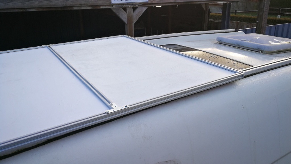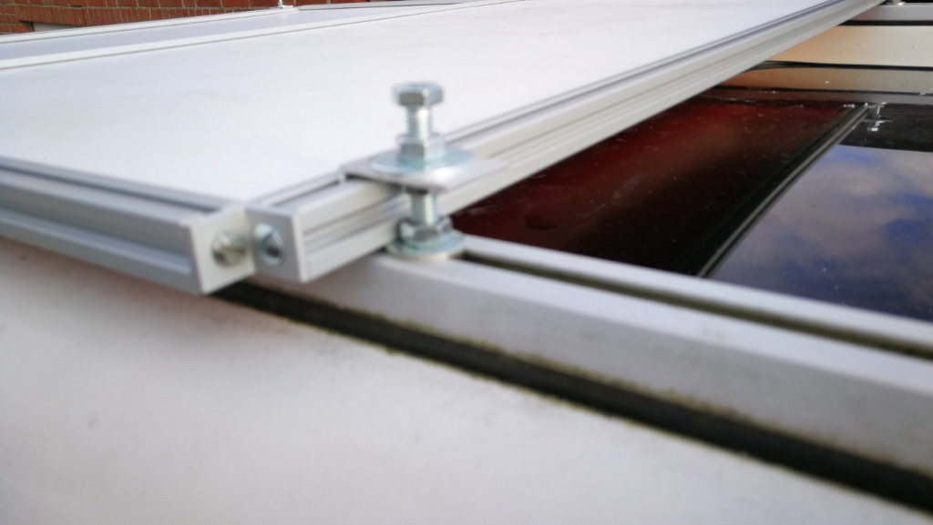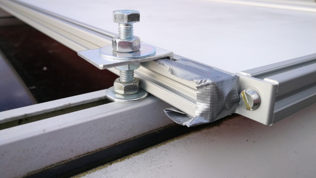 In de sleuven van de Aluxprofielen heb ik 5mm pvc hardschuimplaat geklemd en daar monteer ik de zonnepanelen zelf op met clips. Zo hoef ik niet in het dak te boren en blijf ik flexibel. Er kan een paneel bijgezet worden, of alles kan eraf mocht dat ooit nodig zijn. Als alles werkt dan maak ik de imperial zelf scharnierbaar zodat in een noodgeval het paneel richting de zon gescharnierd kan worden.