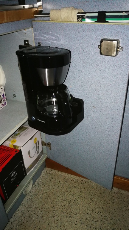 Nog wel ff een 12V koffiezetter gescoord. Die dingen staan altijd in de weg, maar deze kon hangend gemonteerd worden. Binnenkant van het deurtje paste precies.