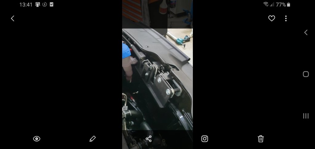 Kijken of het lukt ; ik heb hier nog 2 foto's van het Bearlock motorkapslot. Oerdegelijk en sterk. Dan zit er dieper in het motorcompartiment nóg een slot op de kabel. Dus als je wilt kun je op 1 bus 5 Bearlocks monteren als complete set.
