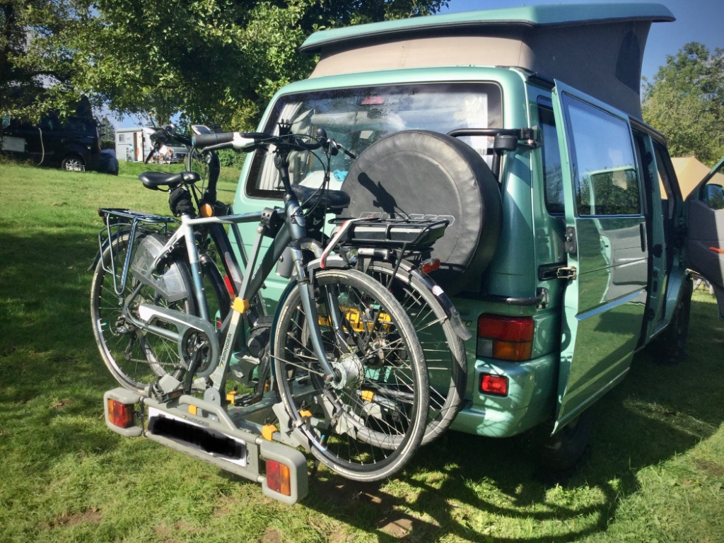 Hierbij foto van syncro met reservewiel achterop en fietsendrager. In combinatie met 17 inch velgen is hangt de fietsendrager ongeveer 25 cm boven de weg. Fietsen moeten er inderdaad af om de klep open te kunnen doen. Fietsendrager kan naar beneden klappen en hoeft er dan niet af. In de praktijk verwijder ik fietsendrager altijd gelijk bij aankomst. Is heel gemakkelijk; 1 bout losdraaien en van de trekhaak tillen.
