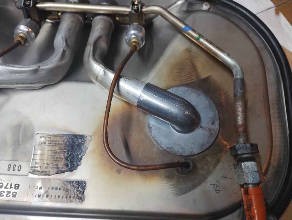 De branderkop is natuurlijk gesmolten en onbruikbaar en de RVS onderplaat is kromgetrokken. Bij de demontage van de andere brander kwamen de resten van de originele pakkingen in brokjes eraf vallen.