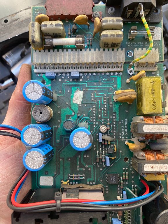 Verder heb ik even gekeken naar de omvormer. Ik had al eerder laten weten dat een aantal kabels flink is doorgebrand. Dus mijn vermoeden was dat de omvormer toast zou zijn. Hoewel ik hier echt kennis te kort kom lijkt het me nog niet zo rampzalig. 2 van de zekeringen waren kapot daar zaten 's' zekeringen in terwijl er 't' op de printplaat staat is daar een goeie reden voor? ik heb er maar trage in gezet. verder is de onderstaande foto wat craquelé dus die moet vervangen worden.